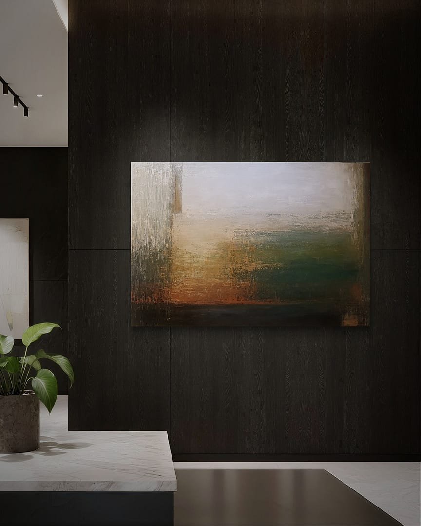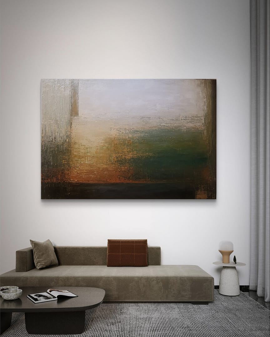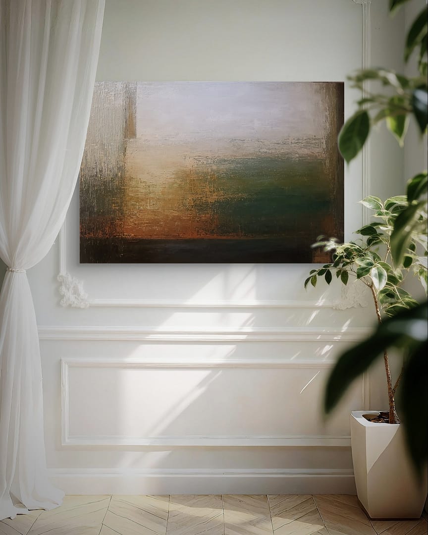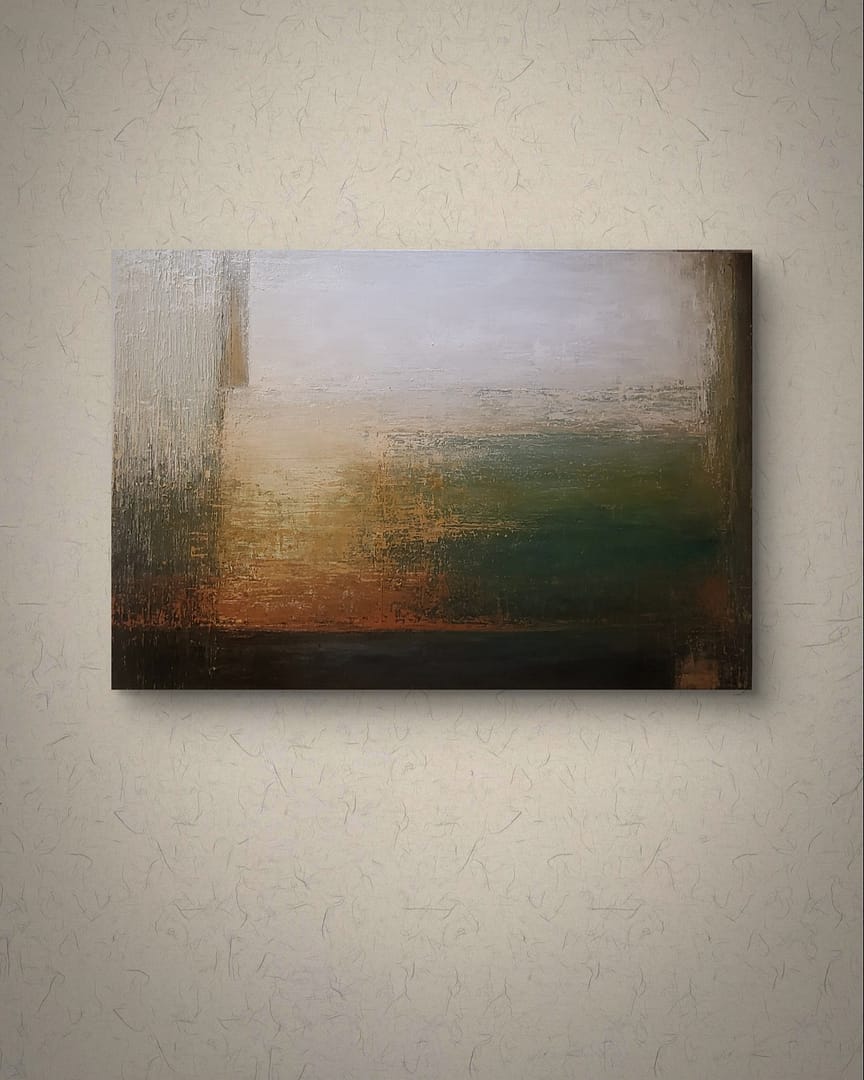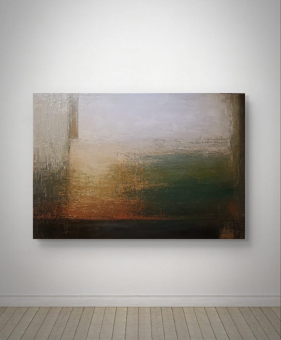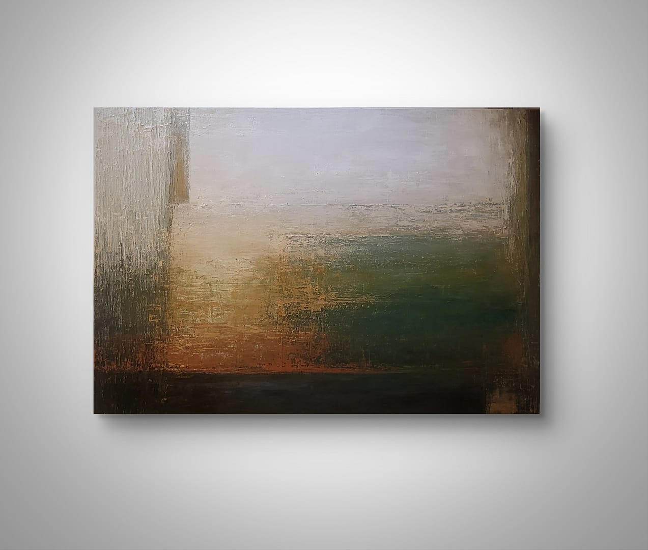 Obraz olejny w stylu abstrakcyjno-geometrycznym z elementami „deszczu”, silnym akcentem zieleni oraz bieli i ceglanymi detalami. Zdobiony złotą farbą dodaje elegancji i wyrafinowania. Radosny, rozświetlający i nowatorski z gradacją barwną od bieli po czerń sprawdzi się we wnętrzach nowoczesnych, loftowych, minimalistycznych w otoczeniu roślinności.