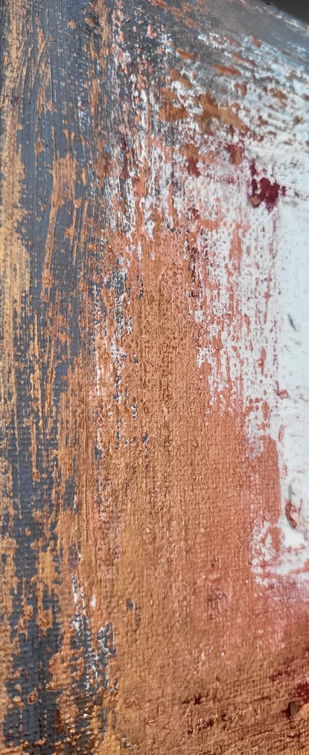 Materiały: Płótno bawełniane zagruntowane na ramie z drewna sosnowego, farby olejne, szpachla, pędzel, sykatywa, werniks damarowy błyszczący.