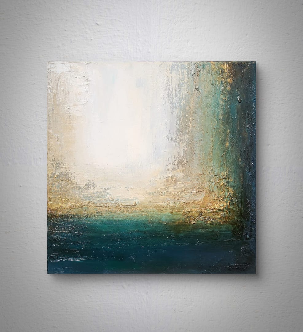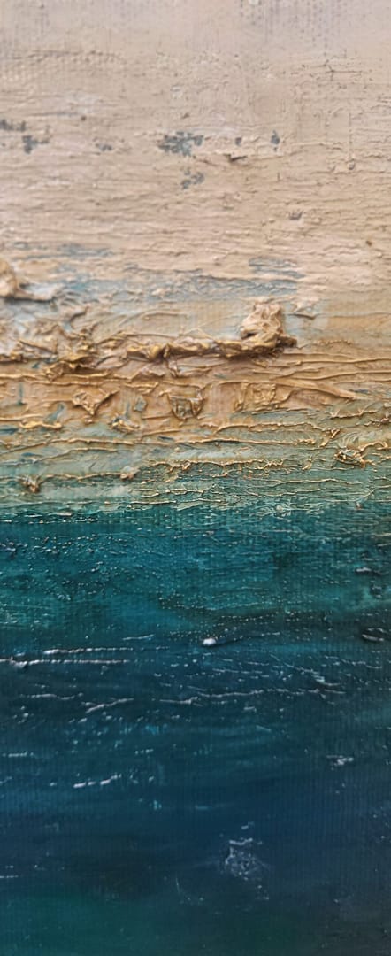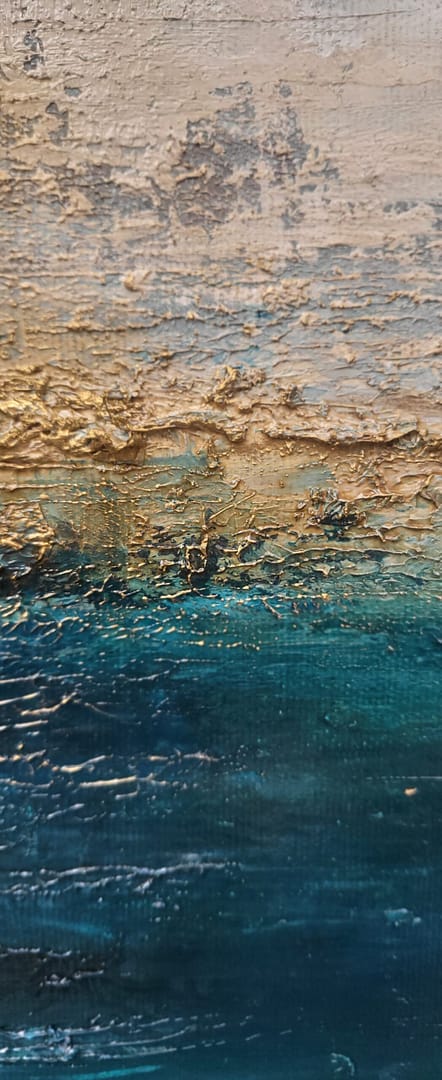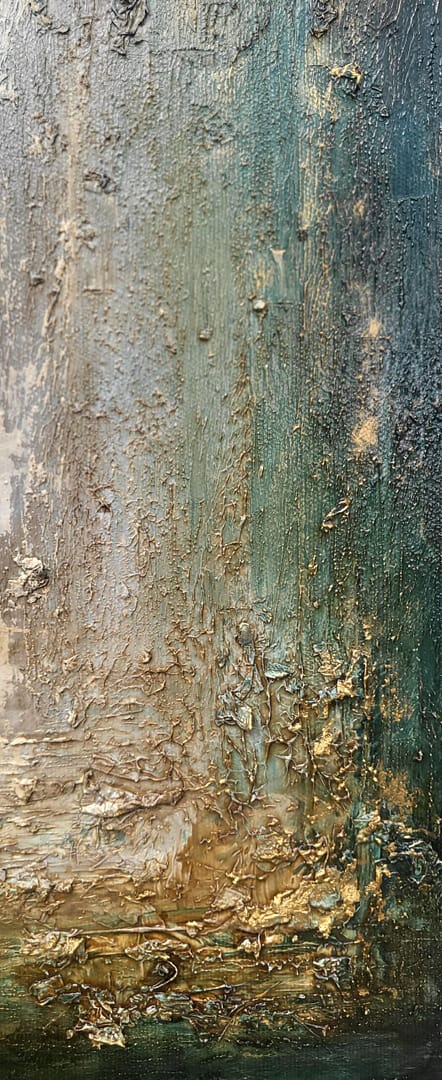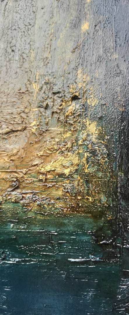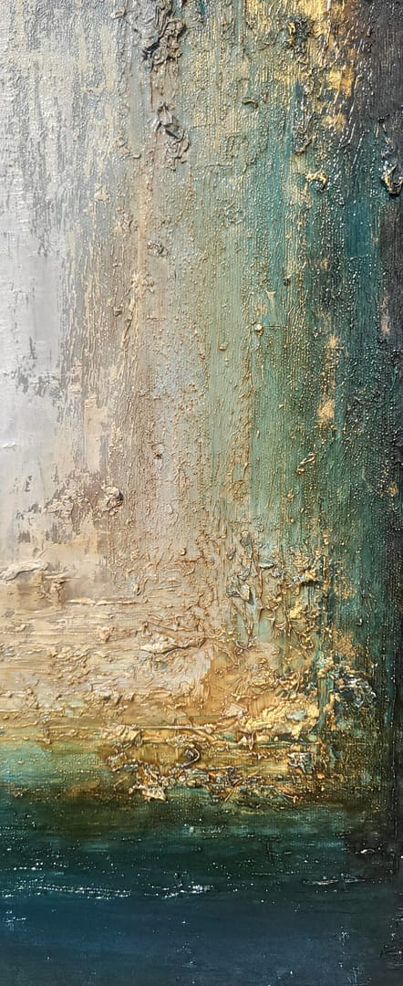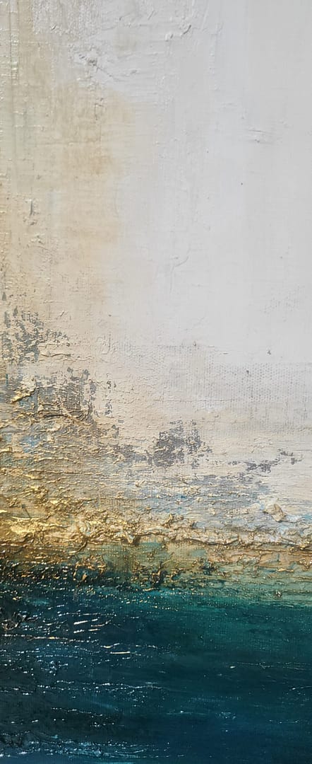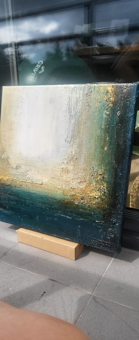 Obraz olejny abstrakcyjno-geometryczny, cechujący się zdecydowaną fakturą, przestrzenią w zieleniach, granatach, beżach i bieli. Złote zdobienia dodają mu elegancji, werniks postarzający głębi a faktura nieco chaotyczna i nieokiełznana przyczyniła się do tytułu obrazu – „Skrawki” są dynamiczne, w ruchu, w pozornym nieładzie.