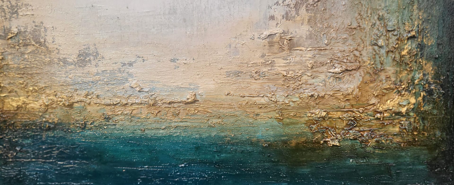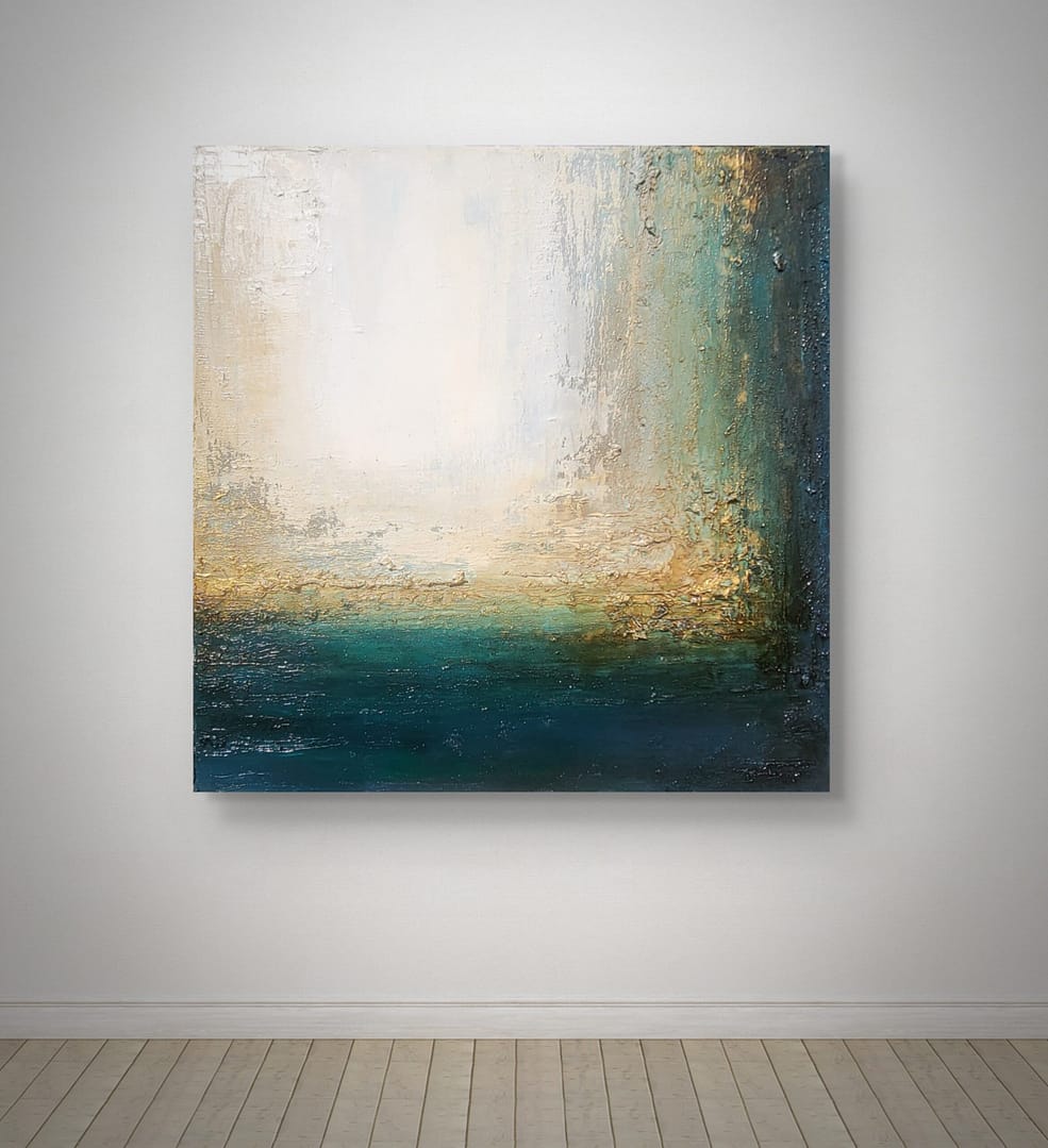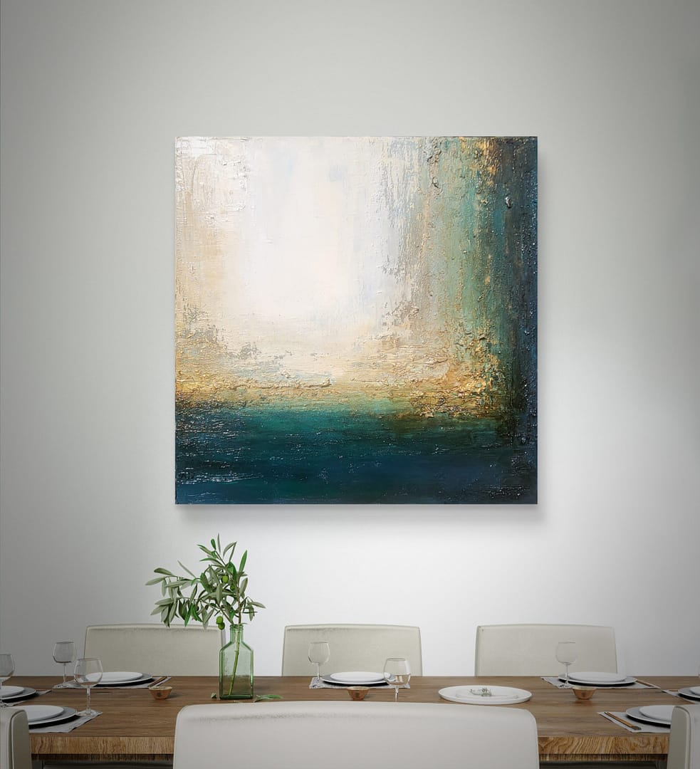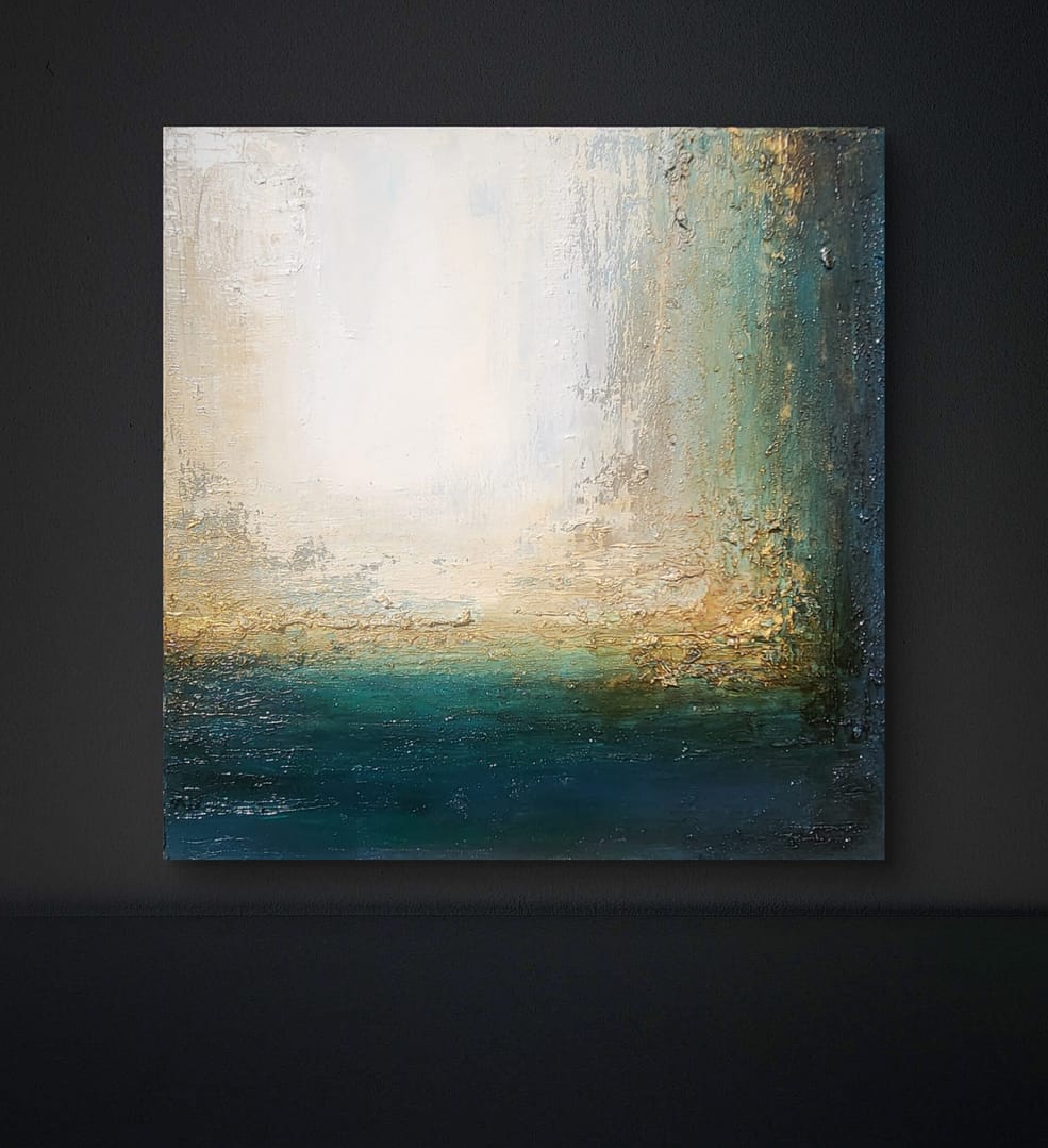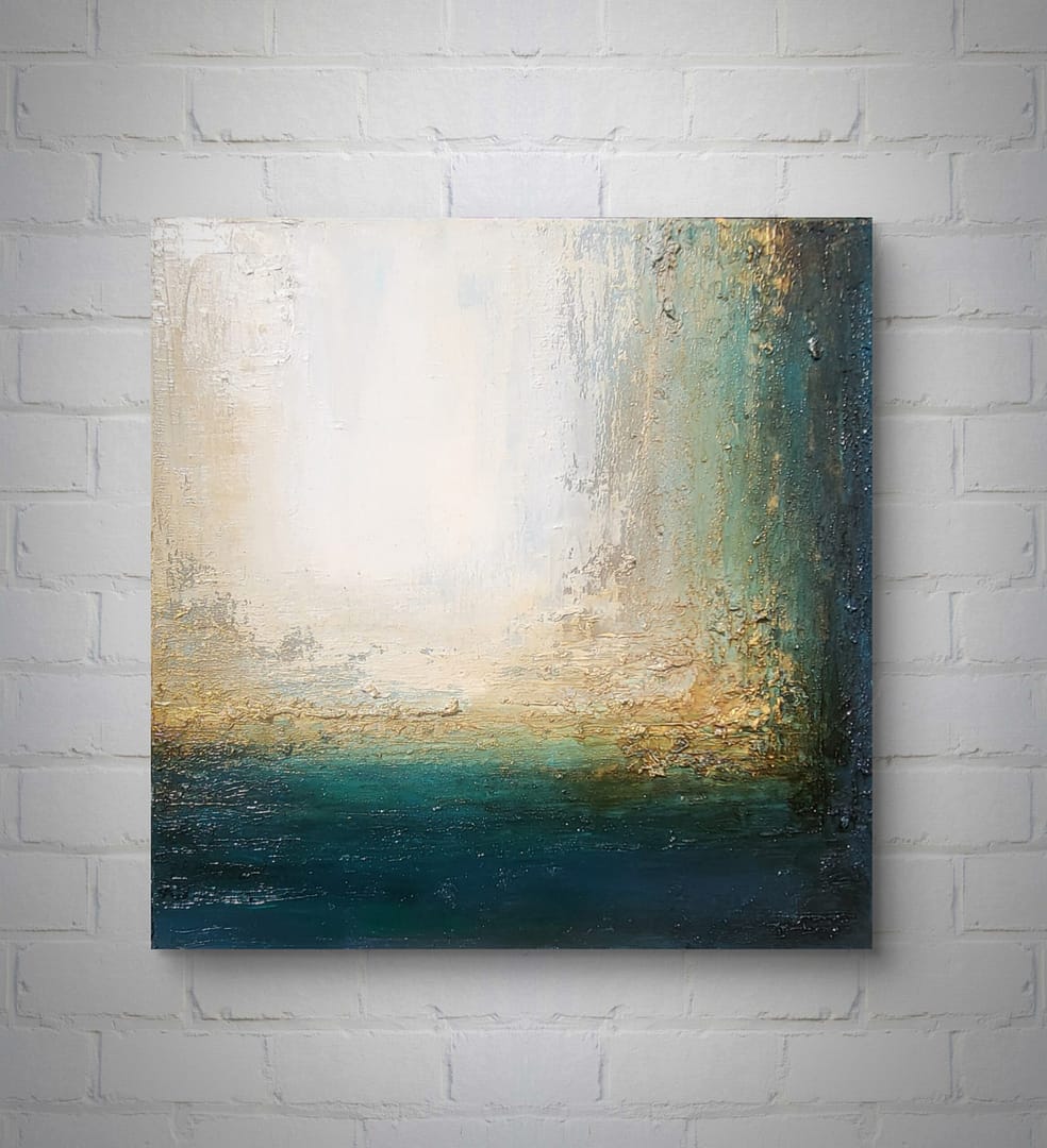 Obraz olejny abstrakcyjno-geometryczny, cechujący się zdecydowaną fakturą, przestrzenią w zieleniach, granatach, beżach i bieli. Złote zdobienia dodają mu elegancji, werniks postarzający głębi a faktura nieco chaotyczna i nieokiełznana przyczyniła się do tytułu obrazu – „Skrawki” są dynamiczne, w ruchu, w pozornym nieładzie.