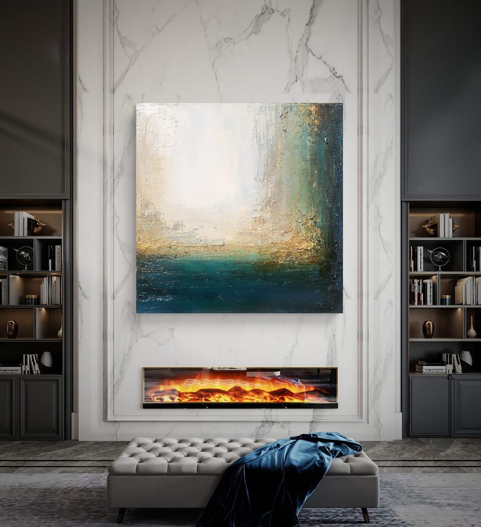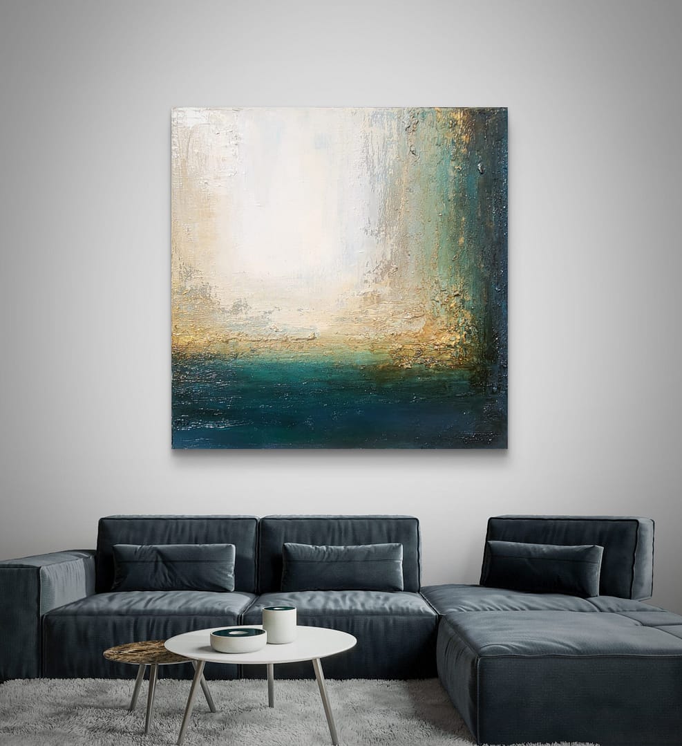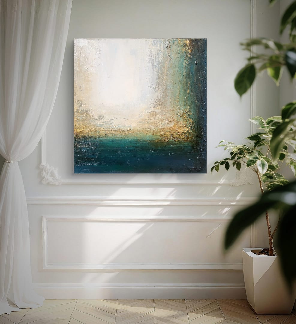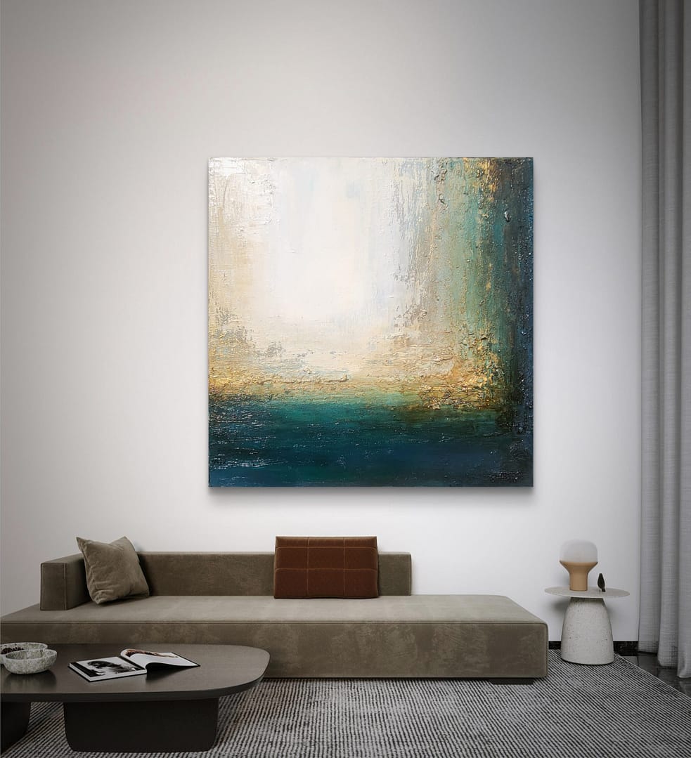 Obraz olejny abstrakcyjno-geometryczny, cechujący się zdecydowaną fakturą, przestrzenią w zieleniach, granatach, beżach i bieli. Złote zdobienia dodają mu elegancji, werniks postarzający głębi a faktura nieco chaotyczna i nieokiełznana przyczyniła się do tytułu obrazu – „Skrawki” są dynamiczne, w ruchu, w pozornym nieładzie.