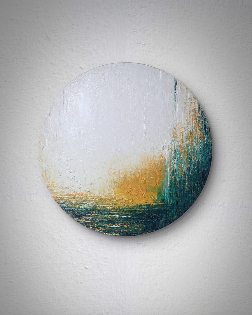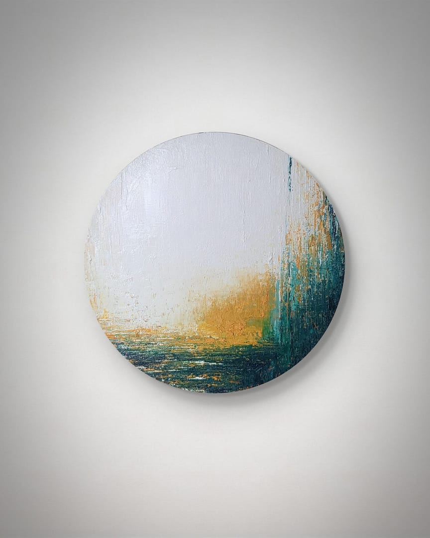 Stworzony do zadziwiania, onieśmielania, robienia dużego pierwszego wrażenia jako solitaire. Wiele warstw struktury i przenikające się na przemian żółcie i turkusy naniesione grubo szpachlą sprawiają, że obraz jest niezwykle silny, wyrazisty, odważny. Jest to próba znalezienia tej konkretnej jednej żółtej barwy, jaka najlepiej odzwierciedli słońce, którego zimą tak bardzo nam brakuje.