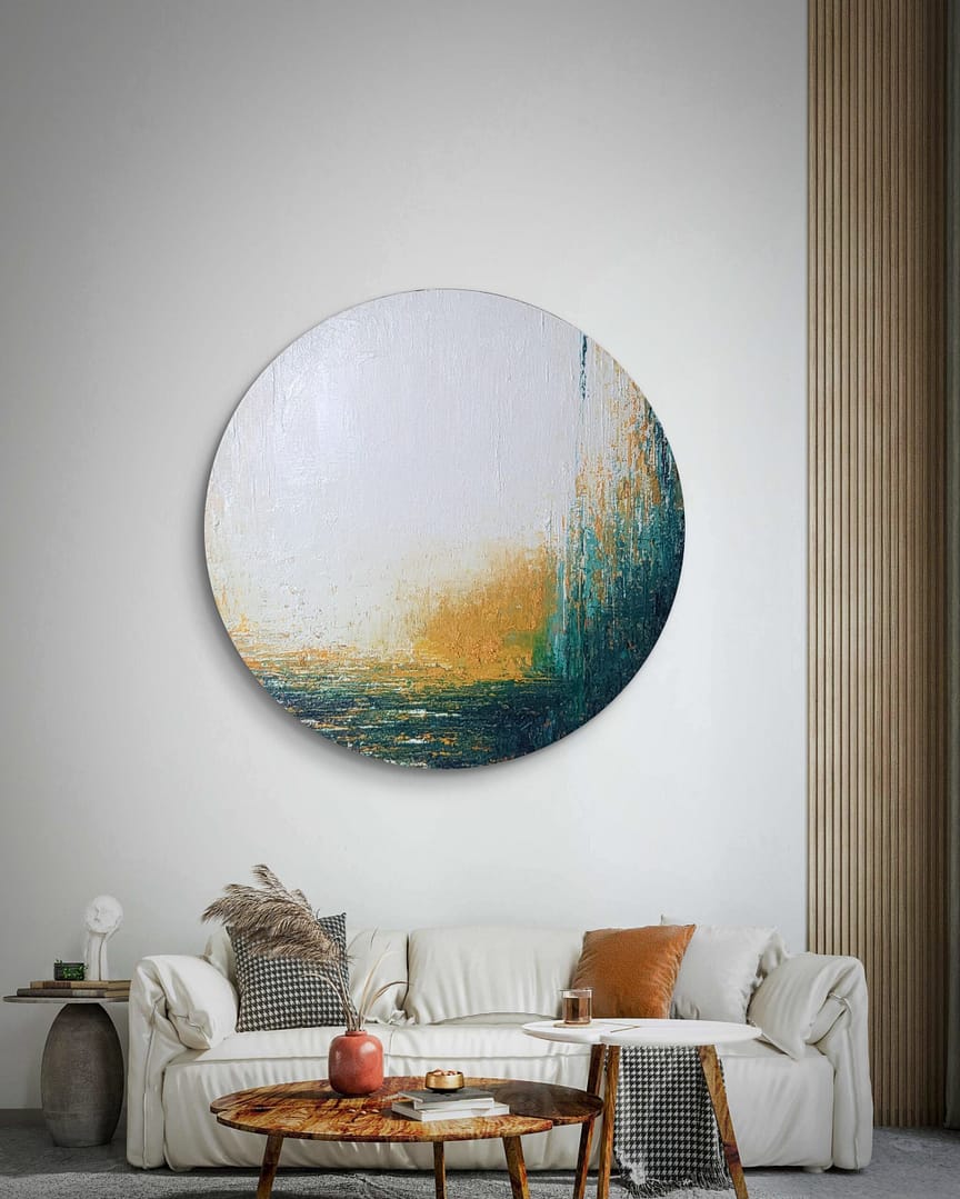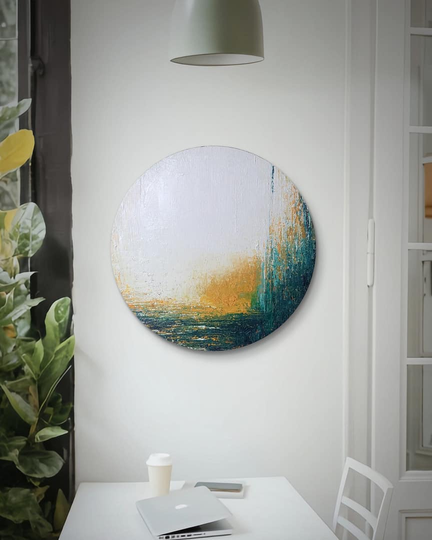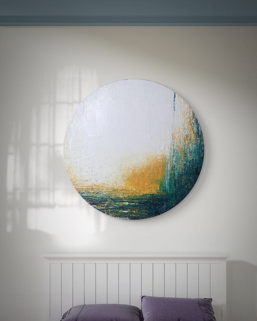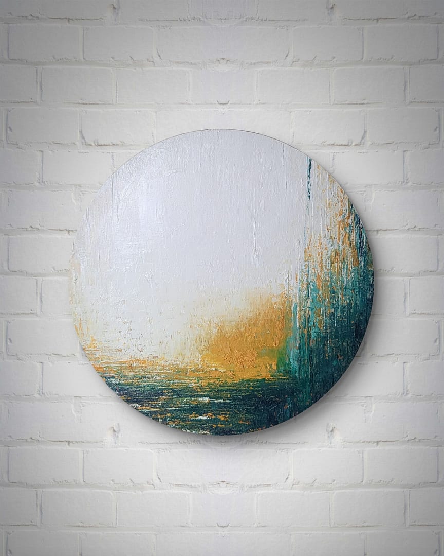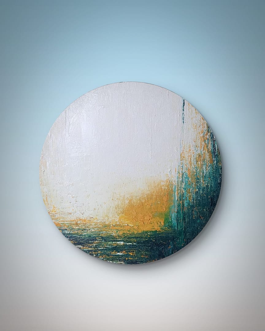Olejna abstrakcja z bardzo silną strukturą i odważną kolorystyką. Obraz na płótnie okrągłym, bez klinów.
