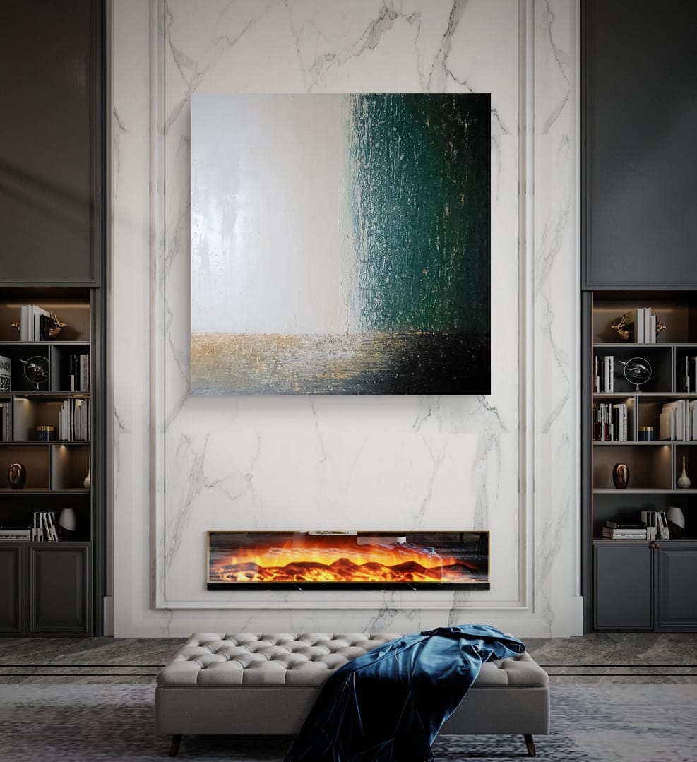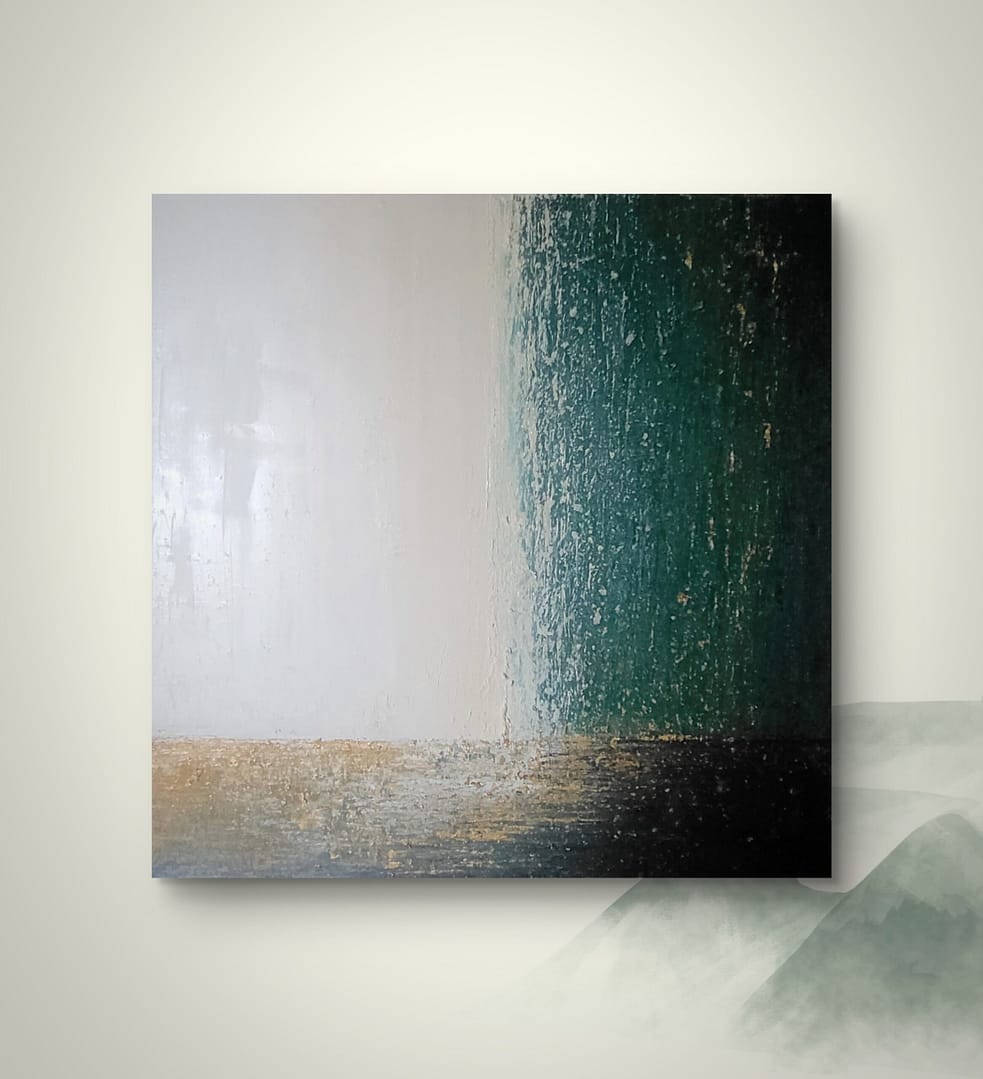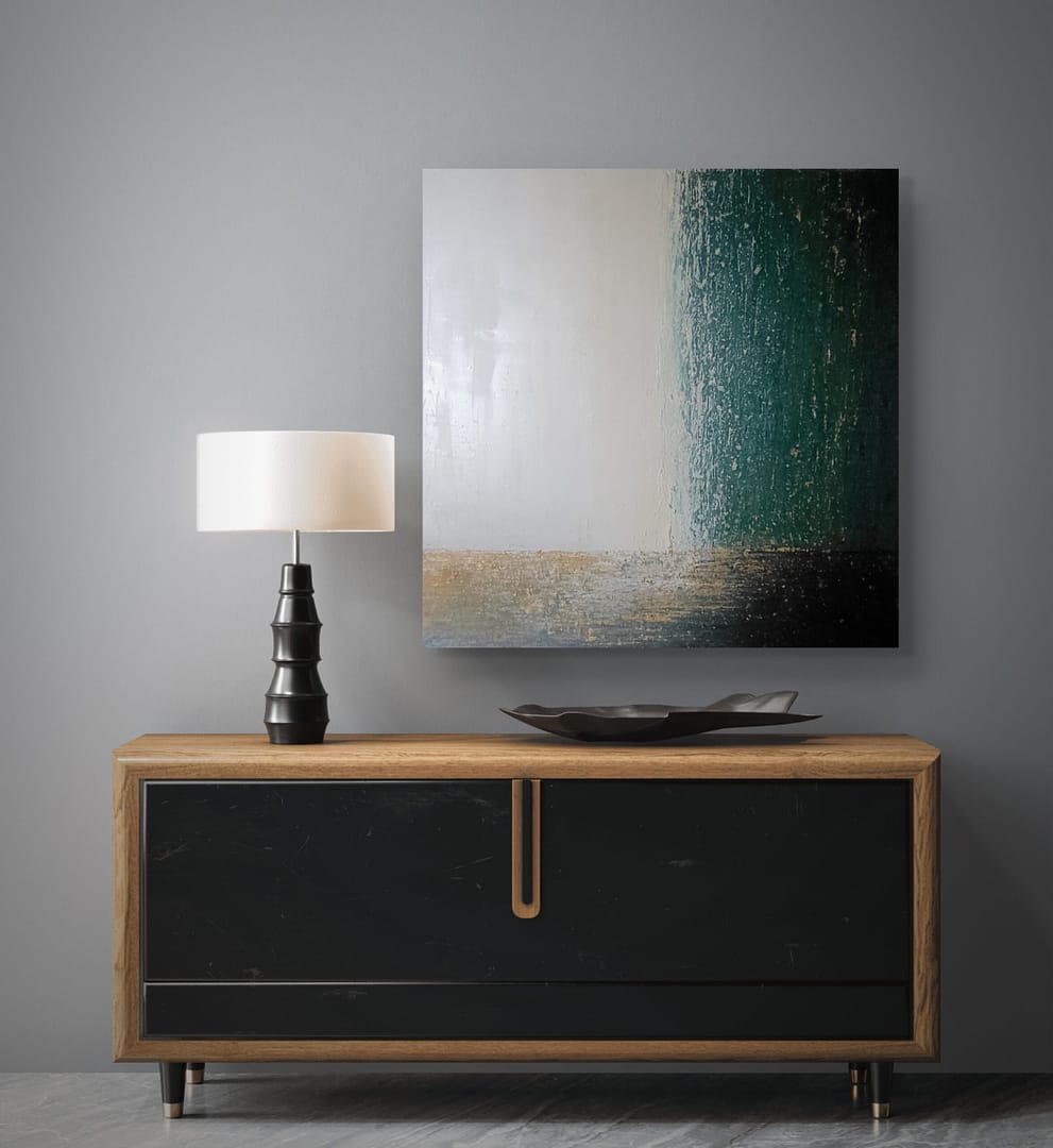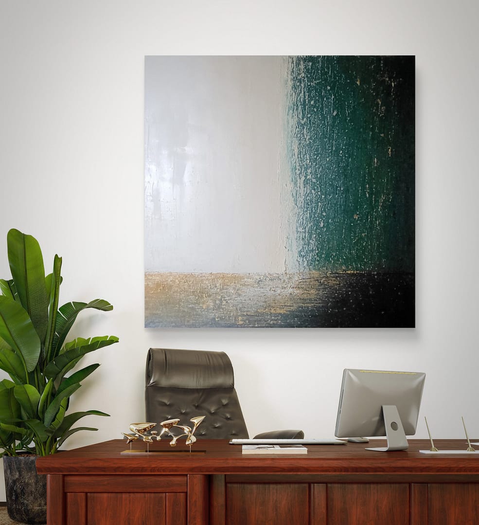 Obraz olejny w stylu abstrakcyjnym w wariacji szmaragdowej na specjalne zamówienie do Salonu Bernacki w Łodzi 🙂